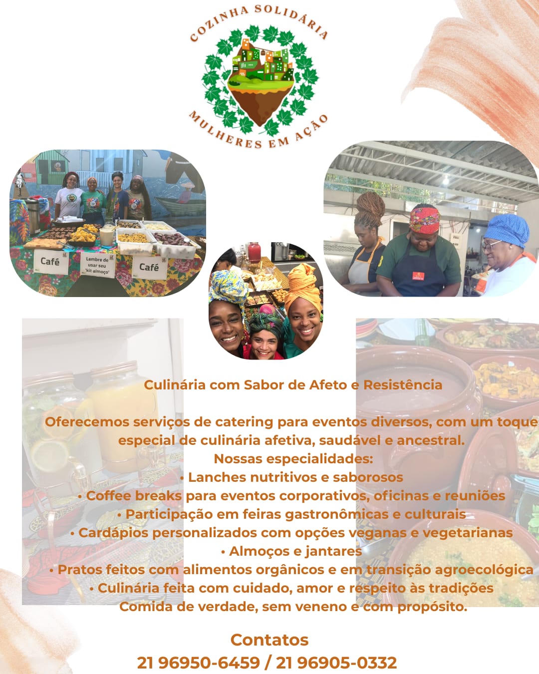 Servimos comida de verdade, feita com alimentos orgânicos e em transição agroecológica, sem veneno no prato. Atuamos em feiras, eventos e ações solidárias, sempre valorizando a culinária afetiva, saudável e ancestral. Nossa missão é fortalecer a autonomia das mulheres, a economia solidária e a soberania alimentar.