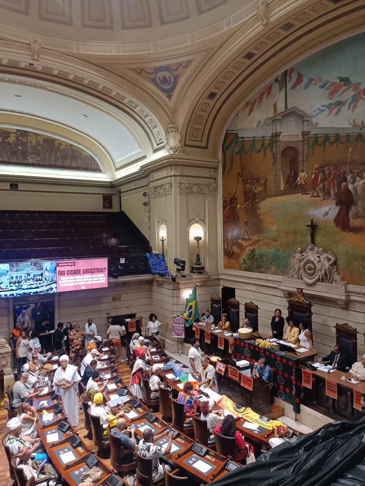 Durante o ato-ebó coletivo, houve a lavagem das escadarias da Câmara Municipal, cânticos e danças tradicionais, além de uma aula pública. Depois, todos os representantes de terreiros, organizações da sociedade civil, movimentos sociais e mandatos presentes participaram da audiência intitulada “Rio Cidade Ancestral? Cenário de políticas públicas para povos tradicionais de matriz africana como espaço de promoção de saúde e cuidado”, para apresentar o caso e ampliar o debate sobre o papel dessas comunidades para além das suas atribuições religiosas, mas também como espaços de saúde, cuidado coletivo e cultura.
